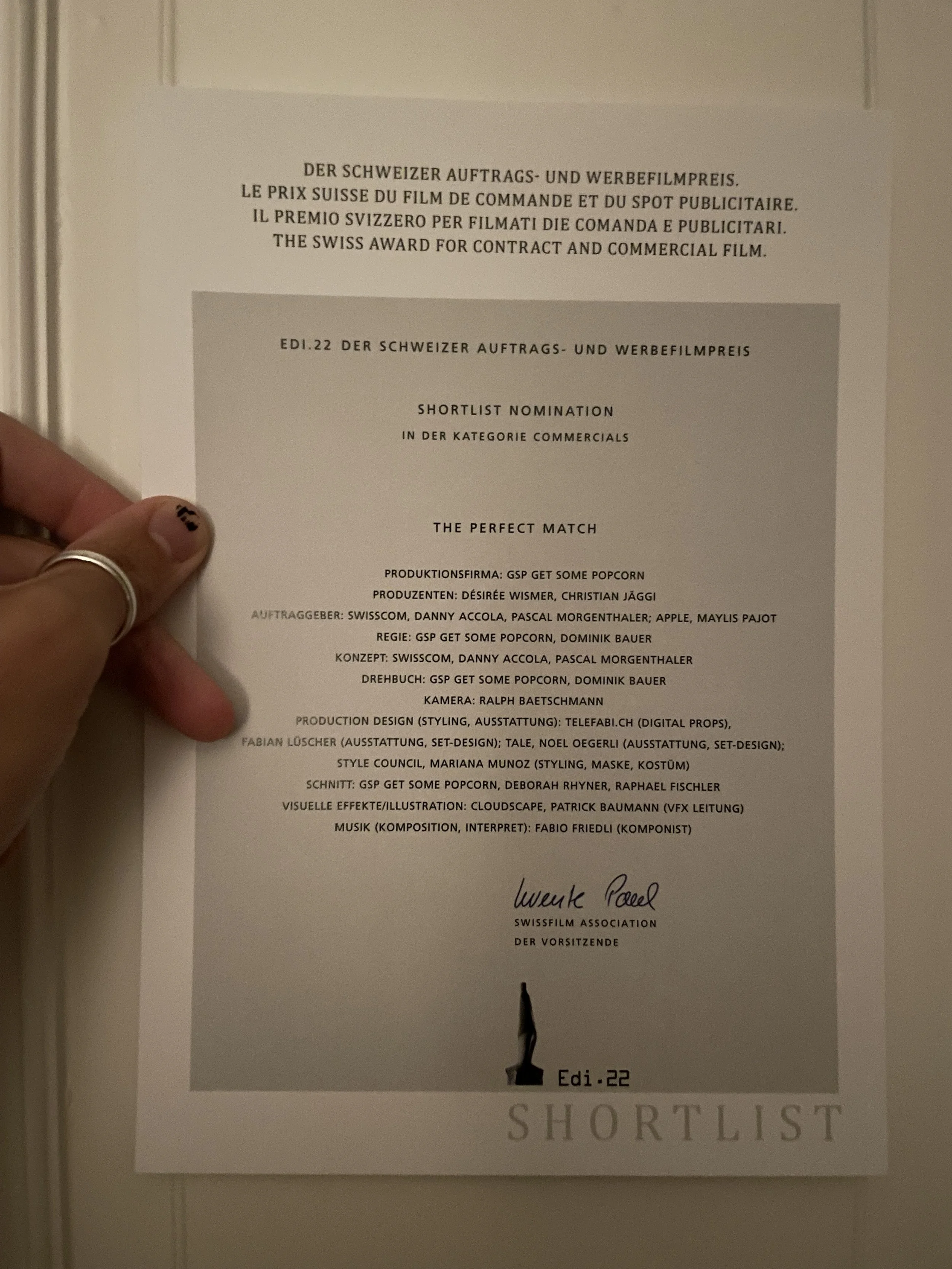 Awards: Winner: Edi 2022 . Best Camera Commercials The Perfect Match (Swisscom x Apple) Edi.2022